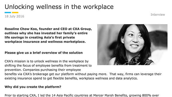 CXA创始人兼首席执行官Rosaline Koo加入了亚洲分析会,就她的创业公司,妇女领导层以及她对即将到来的全球卫生保健,大数据,保险和员工福利趋势的想法进行了谈话。
