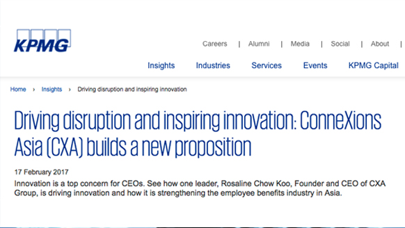 捷报频传的2018年,CXA在各项年度盛典中屡获殊荣,获奖领域横跨人力资源、保险科技及科技创新等行业。奖项包括2018中国人力资源先锋机构-年度最佳员工保障服务机构、中国杰出福利创新奖、亚洲保险评论奖、新加坡数字技术开拓者评选-最具影响力银奖、亚洲最佳CEO人物奖。